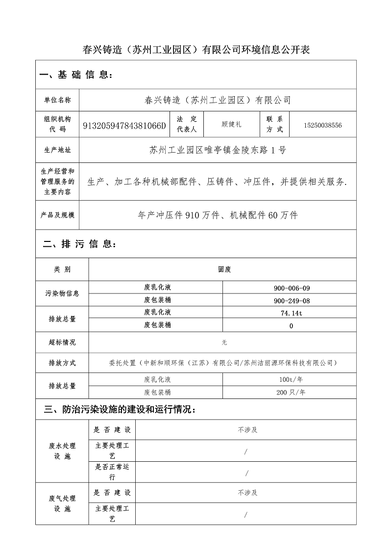 春興鑄造(蘇州工業(yè)園區(qū))有限公司環(huán)境信息公開表